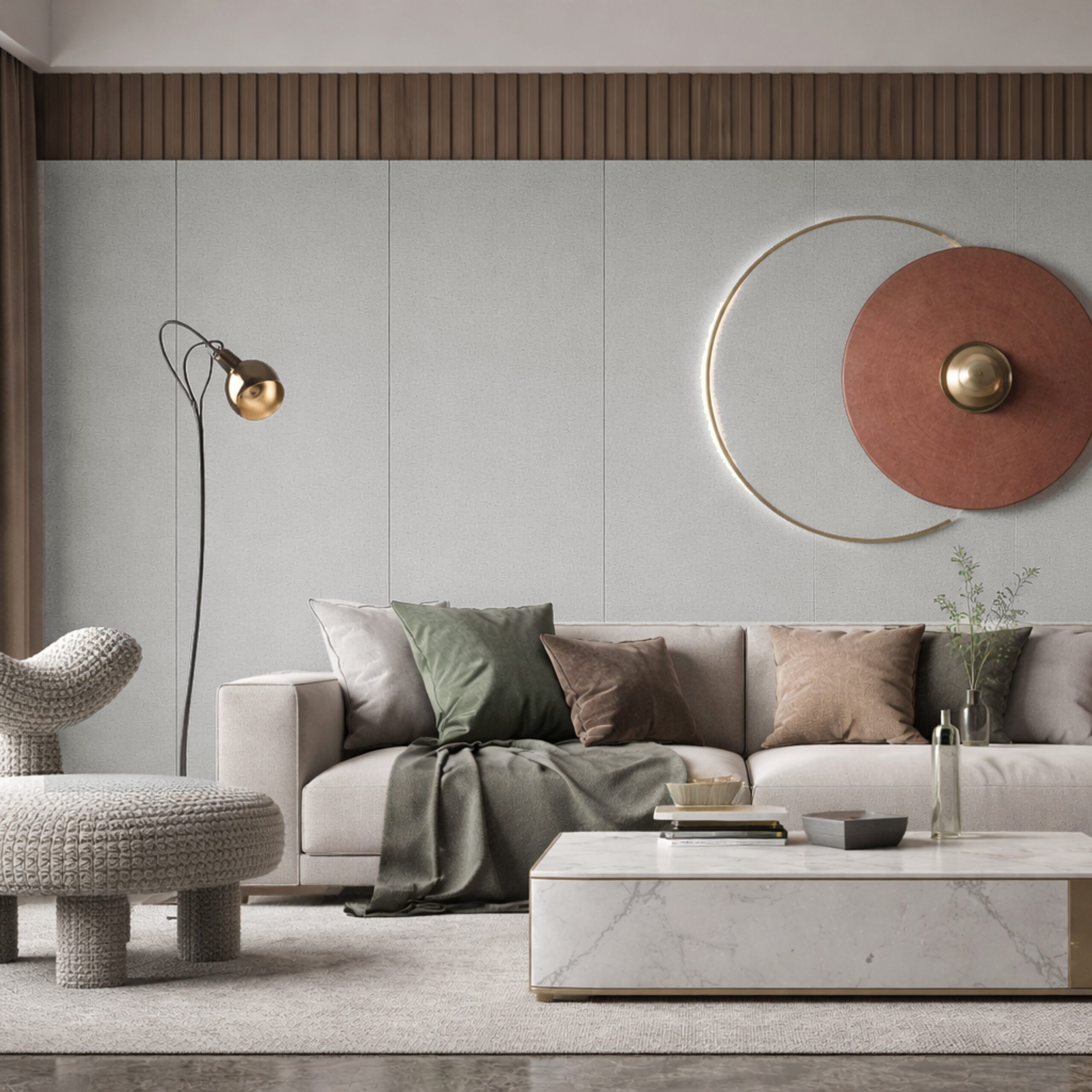 The range includes multiple surface series—Wood Grain, Leather, Metal, Mirror, Monochrome, Rock Pattern, and Cloth—allowing flexibility across different interior design requirements and material palettes.